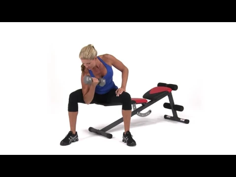 Ga op een uiteinde van een fitness bankje zitten met een dumbbell in je hand rechterhand.